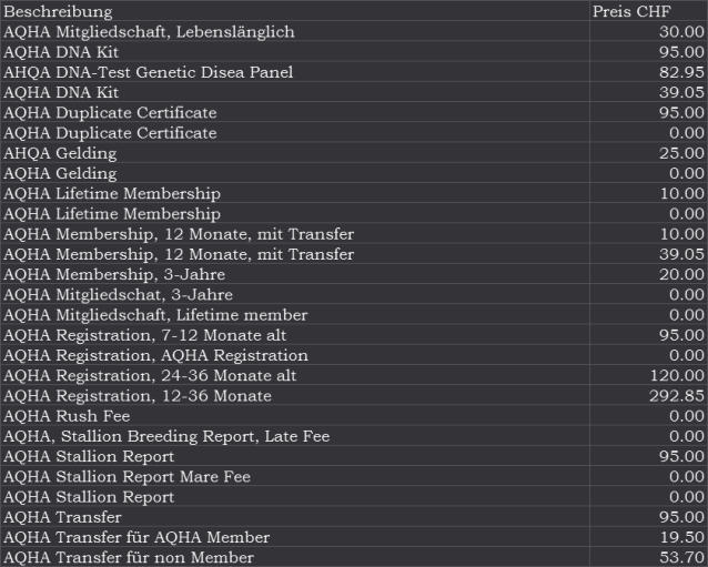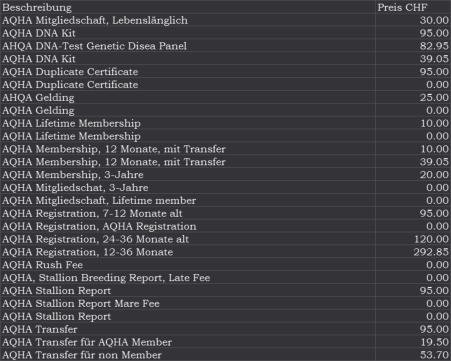 Unsere Preise verstehen sich inkl. 1 Kurier in die USA. Zusätzlich benötigte Kuriere werden separat in Rechnung gestellt.Wir erlauben uns für komplizierte Arbeiten unseren Aufwand per Stunde in Rechnung zu stellen. In diesem Falle kommt ein Stundensatz von CHF 75.-- zum tragen. Eine detaillierte Stundenabrechnung liegt in diesem Falle jeder Rechnung bei. Im Falle einer Abrechnung auf Stundenbasis setzten wir uns vorab mit dem Kunden in Verbindung um den ganzen Ablauf zu besprechen. Zuzüglich zu unseren Kosten kommen die aktuellen Kosten der AQHA. Diese werden zum Tageskurs (Zeitpunkt der Rechnungsausstellung) umgerechnet.Achtung: Es gelten auf jeden Fall die Preise, welche uns durch die AQHA in Rechnung gestellt werden. Die Rechnungen können auf Verlangen jederzeit eingesehen werden.